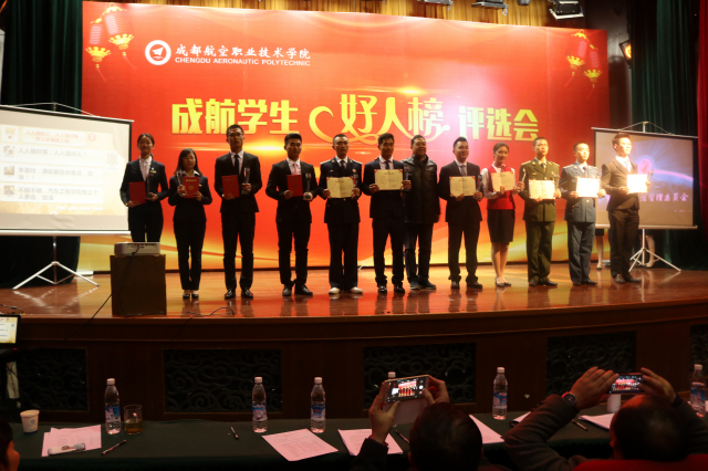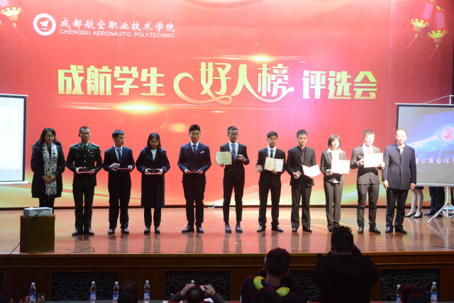 与会领导分别为荣列“成航好人榜”和“提名奖”的同学颁发了奖杯、荣誉证书并合影留念。