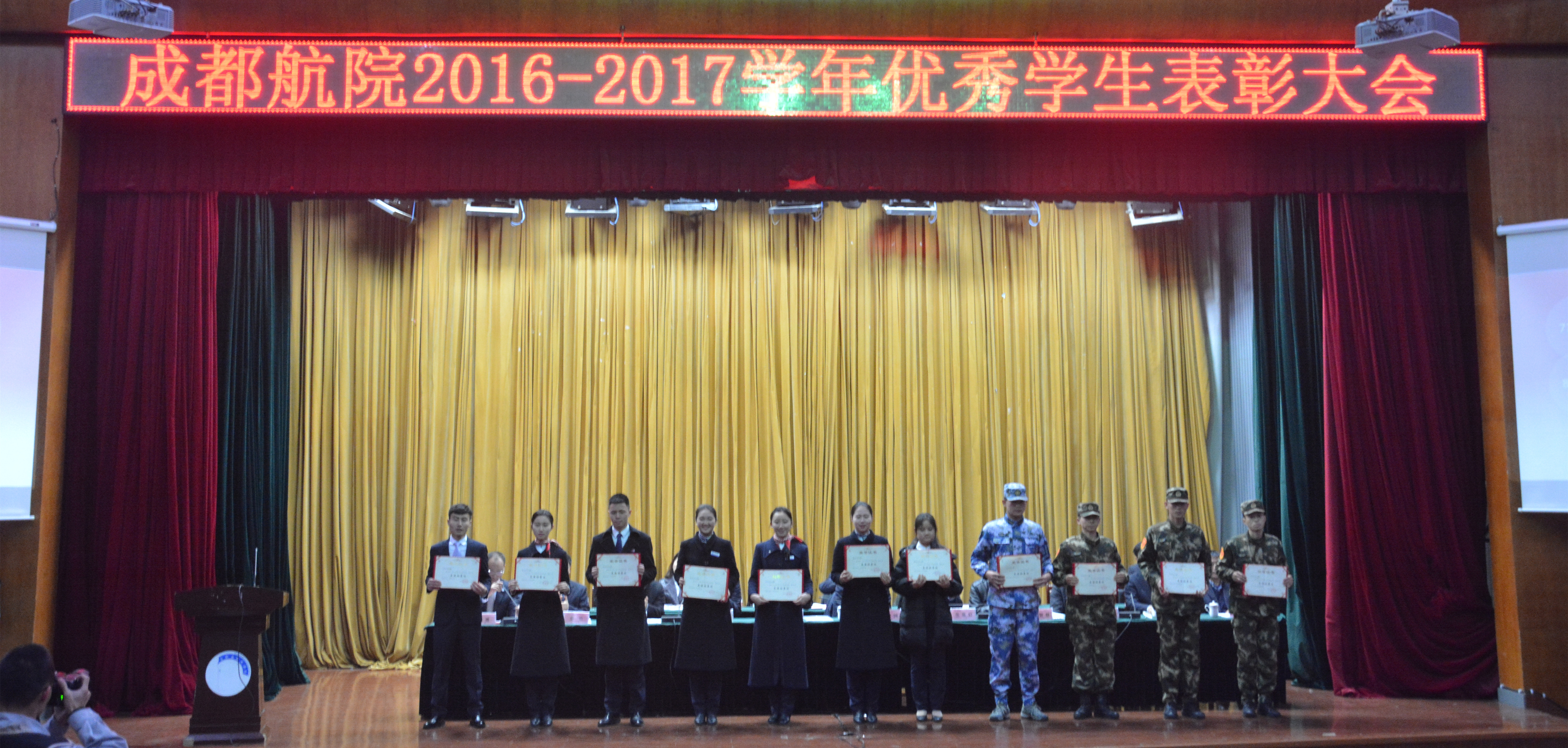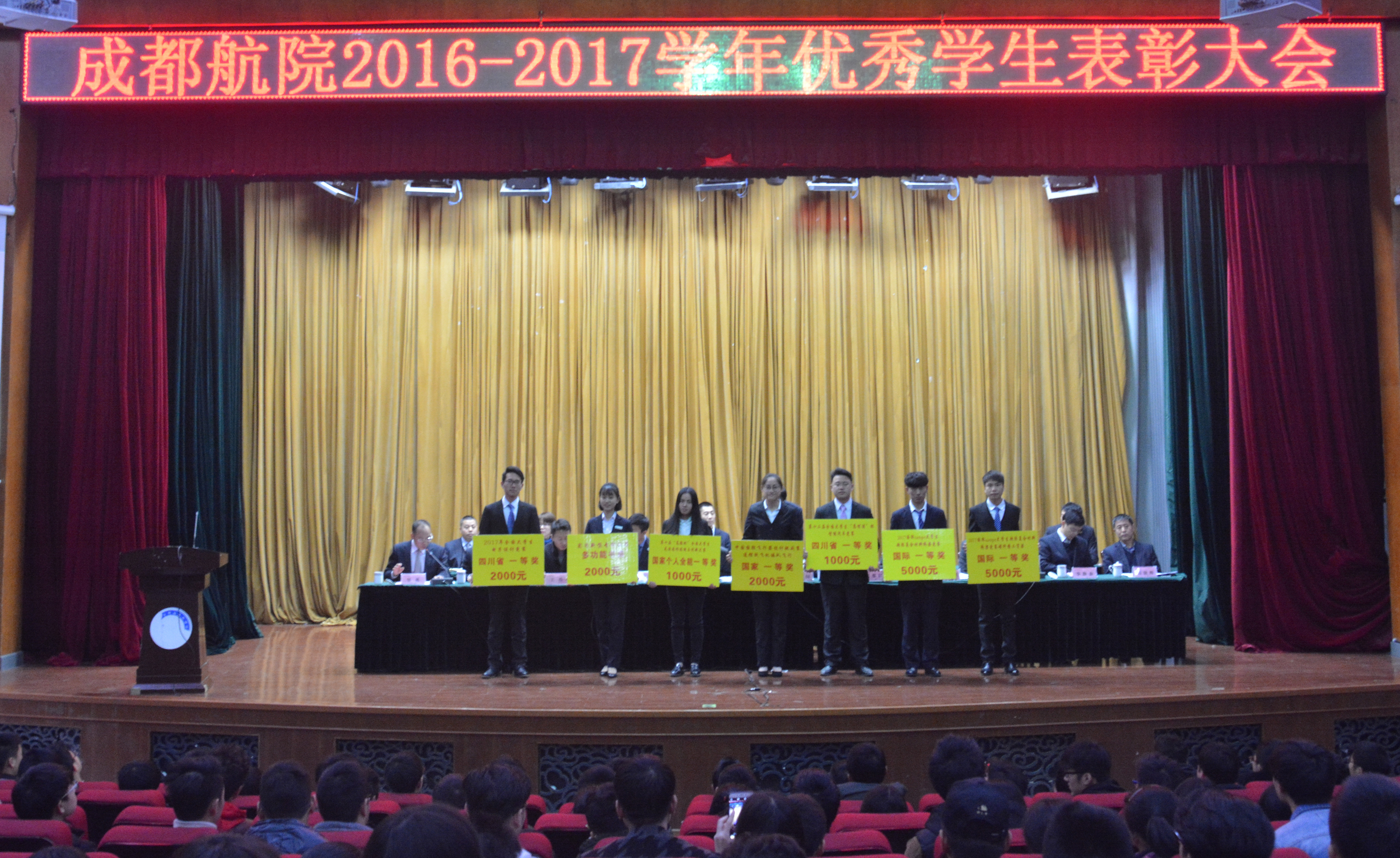2017年12月19日,学校2016—2017学年度优秀学生表彰大会在图书馆大报告厅隆重举行。大会对一年来在“创先争优”活动中表现优异的44个先进班集体、121名“三好学生”、285名优秀学生干部,大众评选的11名“成航好人榜”学生,5名国家奖学金、273名国家励志奖学金(3015名国家助学金),5名学校特等奖学金、1075名一二三等学校奖学金,75名海克斯康和宝利根企业奖学金获得者以及一批为学校赢得国内外荣誉的校外竞赛获奖者(特别是复合材料专业学生团队在SAMPE国际大学生超轻复合材料竞赛中超越国内外众多名校参赛队荣获总冠军,为学校赢得世界级重大荣誉的同学们)进行了表彰和奖励。