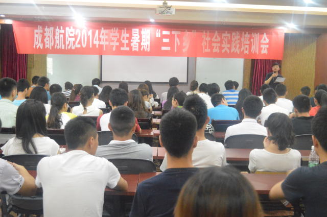 7月10日下午,我院2014年大学生暑期“三下乡”社会实践培训会在图书馆小报告厅举行。院团委书记杨湘伶、院团委老师朱磊、尹成鑫以及各分队带队老师出席了培训会。130名大学生志愿者参加了此次培训会。 院团委书记杨湘伶在培训会上提出了三点要求。她讲道,一是感谢,感谢同学们将在接下来的活动中展现成都航院的学子风貌,将对爱、责任、信念的理解诠释给服务对象。二是嘱托,嘱托同学们通过“适应、融入、给予”以饱满的状态投入到社会实践活动中去。三是希望,希望同学们能在这次社会实践中真正的了解社会,认识自我,尽快的成长蜕变,在此次活动中将自我展示,感受“予人玫瑰,手有余香”的喜悦。愿同学们在火热的七月,用爱心、责任、关怀、理念与信念去尽情的绽放青春! 培训会上,尹成鑫对今年“三下乡”社会实践做了专题培训,从活动意义、自我安全与他人安全、角色转换与心态调整、日程安排、陪护内容、经费使用等方面做了细致讲解。会后,各带队老师给各分队志愿者做了部署安排。 据悉,今年我院暑期“三下乡”社会实践活动共派出130名志愿者,14位带队教师,组成三支“三下乡”分队,奔赴金堂县、中江县和龙泉驿区三地,分别以“感恩奋进,践梦金堂”、“故里寻访,逐梦中江”、“心手相牵,筑梦龙泉”为主题开展“圆梦行动”。  院团委书记杨湘伶讲话