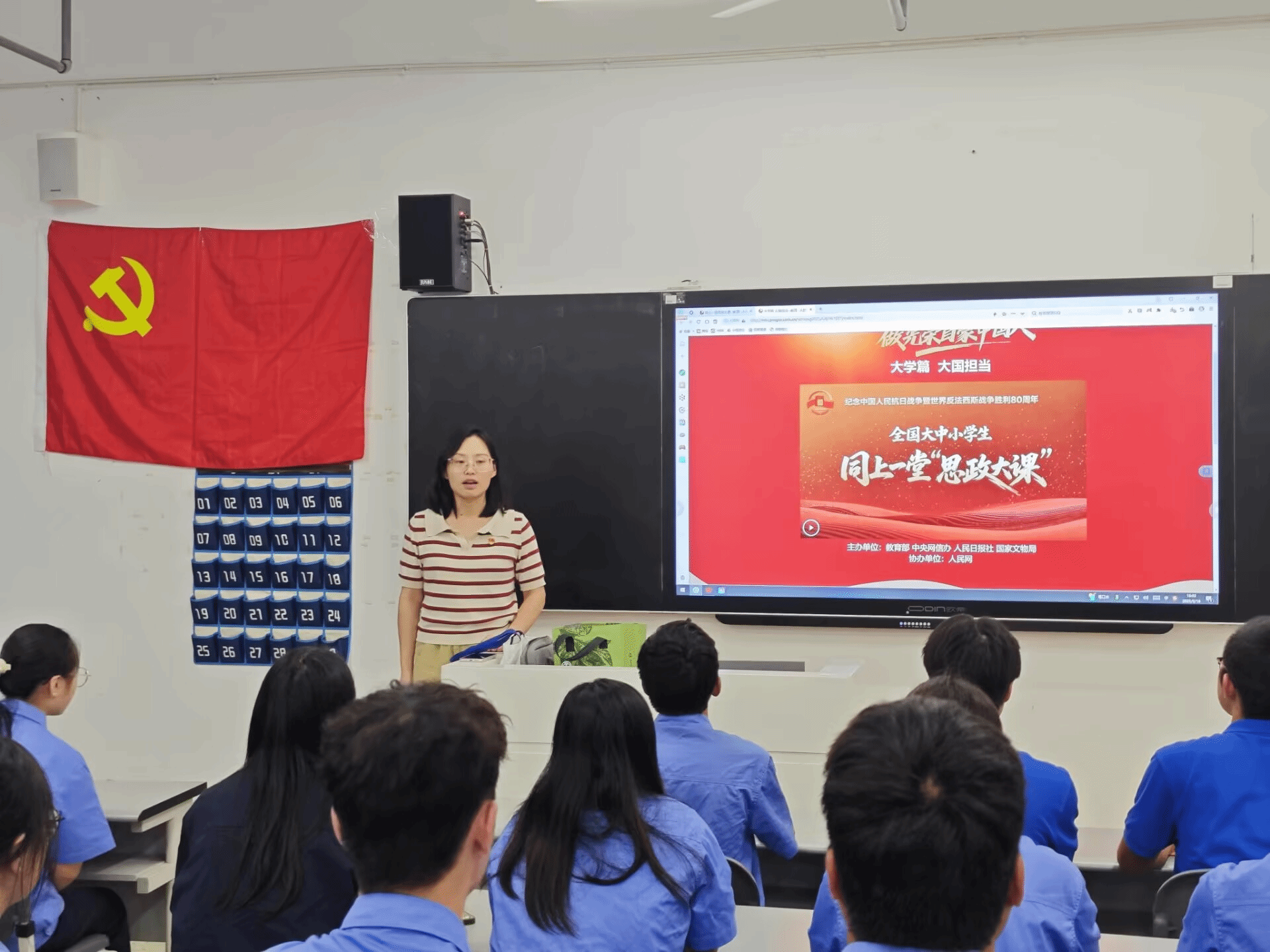 课上,师生一起回顾了习近平总书记在纪念中国人民抗日战争暨世界反法西斯战争胜利80周年大会上的重要讲话:“中国人民抗日战争是艰苦卓绝的伟大战争。在中国共产党倡导建立的抗日民族统一战线旗帜下,中国人民以铮铮铁骨战强敌、以血肉之躯筑长城,取得了近代以来中国反抗外敌入侵的第一次完全胜利。”这段讲话发人深省,让在场师生深切感受到胜利的来之不易与深远的时代意义。