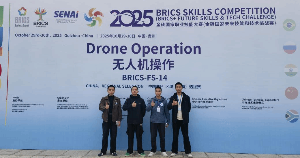 10月30日,2025金砖国家职业技能大赛西南赛区选拔赛正式落下帷幕。成都航空职业技术大学精心组建2支参赛队伍出征赛场,在领队老师王玺鉴带领下,无人机产业学院无人机应用技术专业学生刘福和王浩宇凭借扎实的专业功底与出色的临场发挥成功斩获一等奖1项、潘宇霖和周鑫斩获三等奖1项,充分展现了学校在无人机职业技能人才培养方面的过硬实力。本次大赛聚焦无人机技术前沿领域,赛项设置涵盖无人机组装调试、无人机低空物资运输、无人机智能开发三大核心模块,重点考察选手对无人机系统知识、AI算法基础及工程逻辑的运用能力,要求选手结合智能技术完成任务规划与执行,凸显了“技术+技能”的双重考核导向。