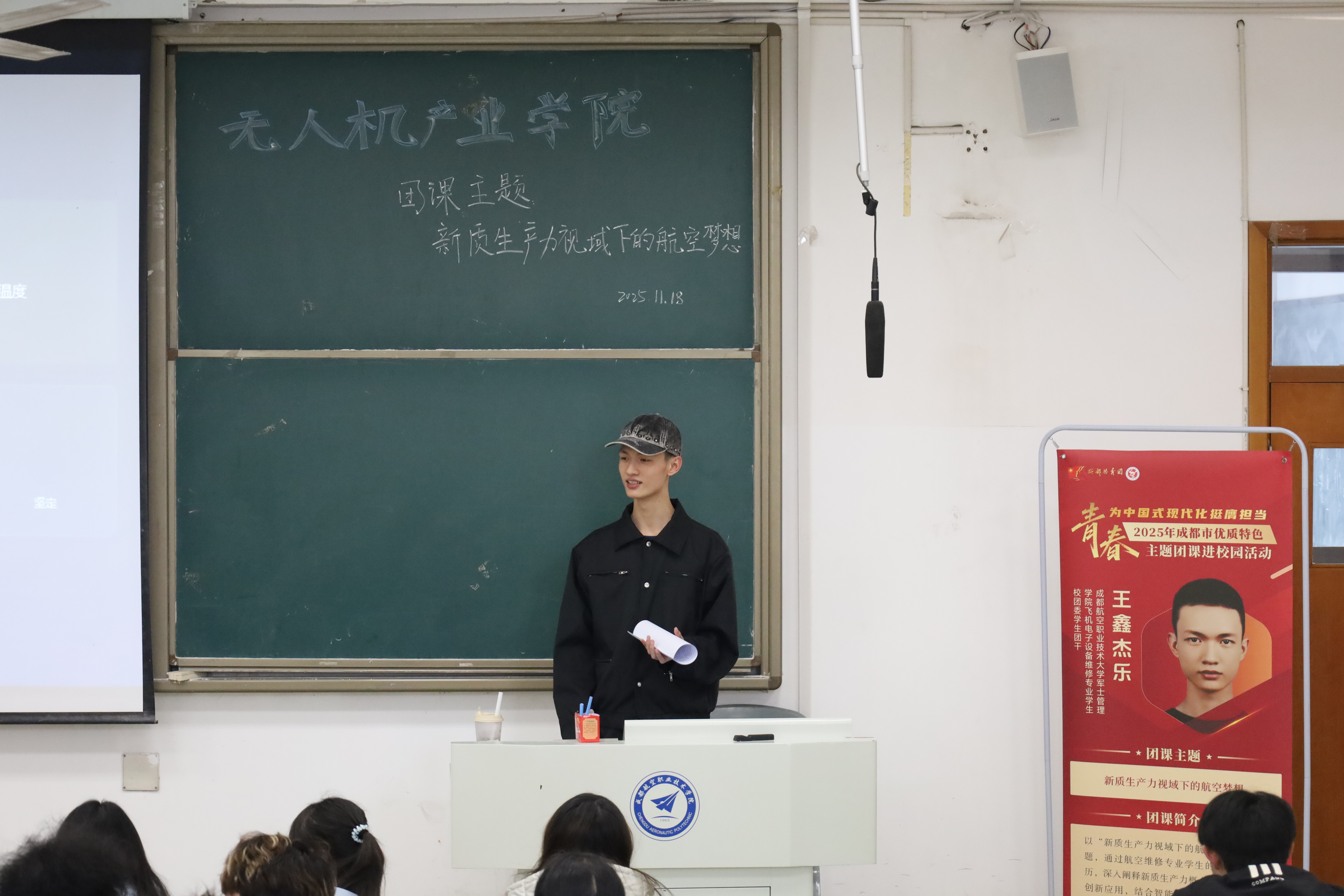 为深入推进学生骨干思想政治引领,强化专业教育与创新人才培养,11月18日,成都市优质特色团课进校园活动走进无人机产业学院,在尚学楼2-207教室为“启航班”学员带来《新质生产力视域下的航空梦想》主题团课。本次活动特邀成都市优质团课主讲人、军士管理学院学生王鑫杰乐担任主讲, “启航班”全体学员及各班团支书参加学习。