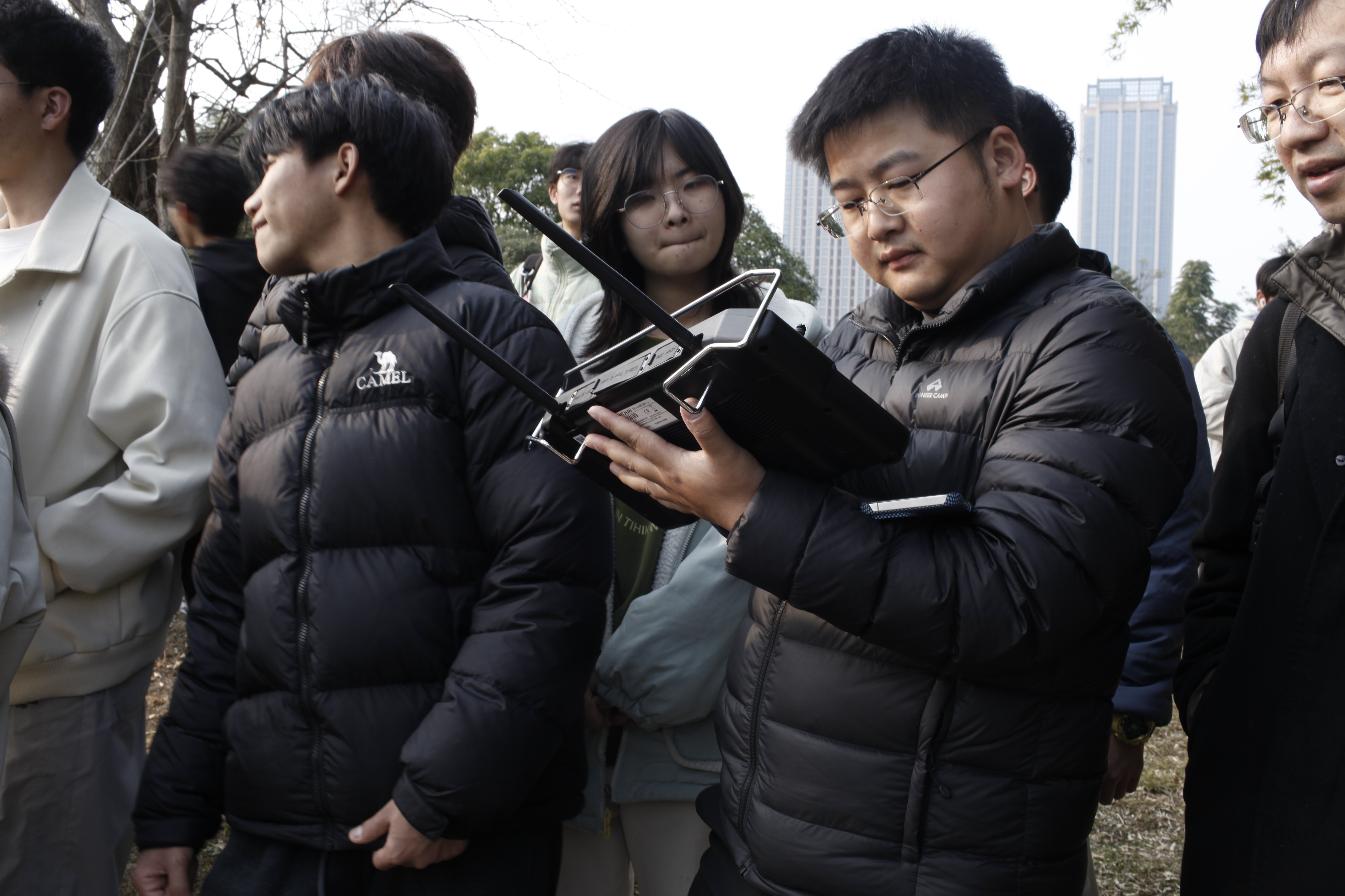 在学校空天地大数据应用创新中心,师生近距离观摩并体验了激光雷达扫描、三维实景建模等低空科技装备,现场演示了高精度三维数据采集与实时成图流程,呈现了低空技术在测绘与地理信息领域的高效应用。随后,在学校怡心湖,廖良波、蒋晨龙指导学生开展无人船水下地形扫描模拟操作,完整展示了从设备操控到数据生成的一体化作业过程,增强了同学们对低空与水上协同测绘技术的直观认识。