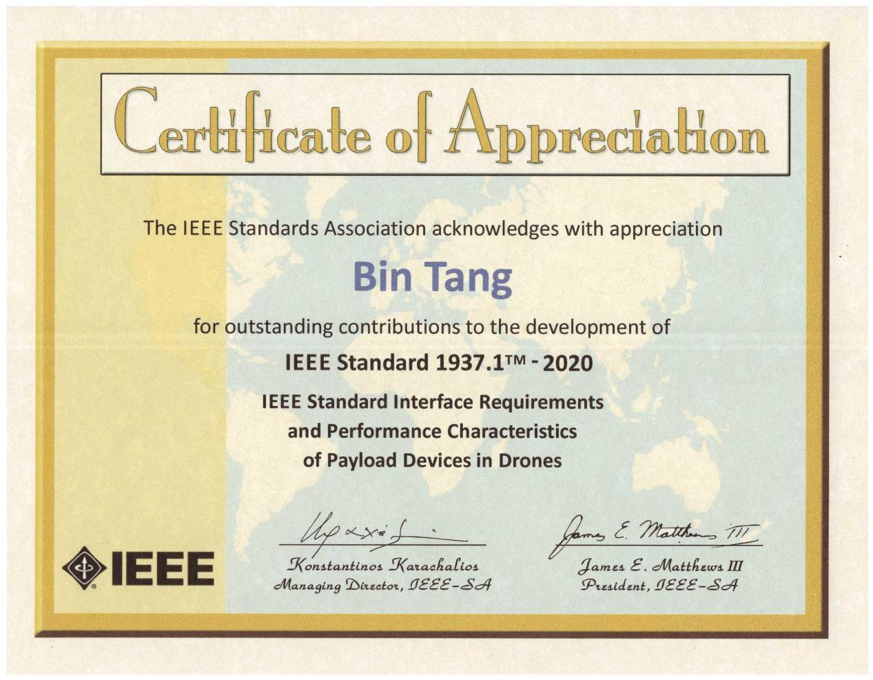 唐斌获得的制定IEEE Std 1937.1国际无人机标准做出卓越贡献证书