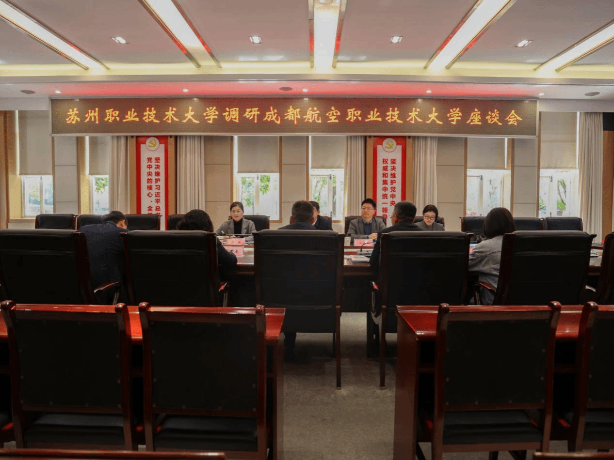 当日下午,调研座谈会在我校行政楼会议室举行,会议由教务处负责人王青春主持。侯孟书对苏州职业技术大学一行表示热烈欢迎,并重点介绍了学校办学历史、专业布局与办学成效,分享我校在航空类特色专业建设、产教融合平台打造、校企协同育人与高技能人才集群培养计划方面的实践,以及面向未来“十五五”发展的目标与思路。侯孟书表示,希望以此次交流为契机,进一步深化两校在专业建设、人才培养、科研合作等方面的互学互鉴,共同探索职业教育高质量发展的新路径。