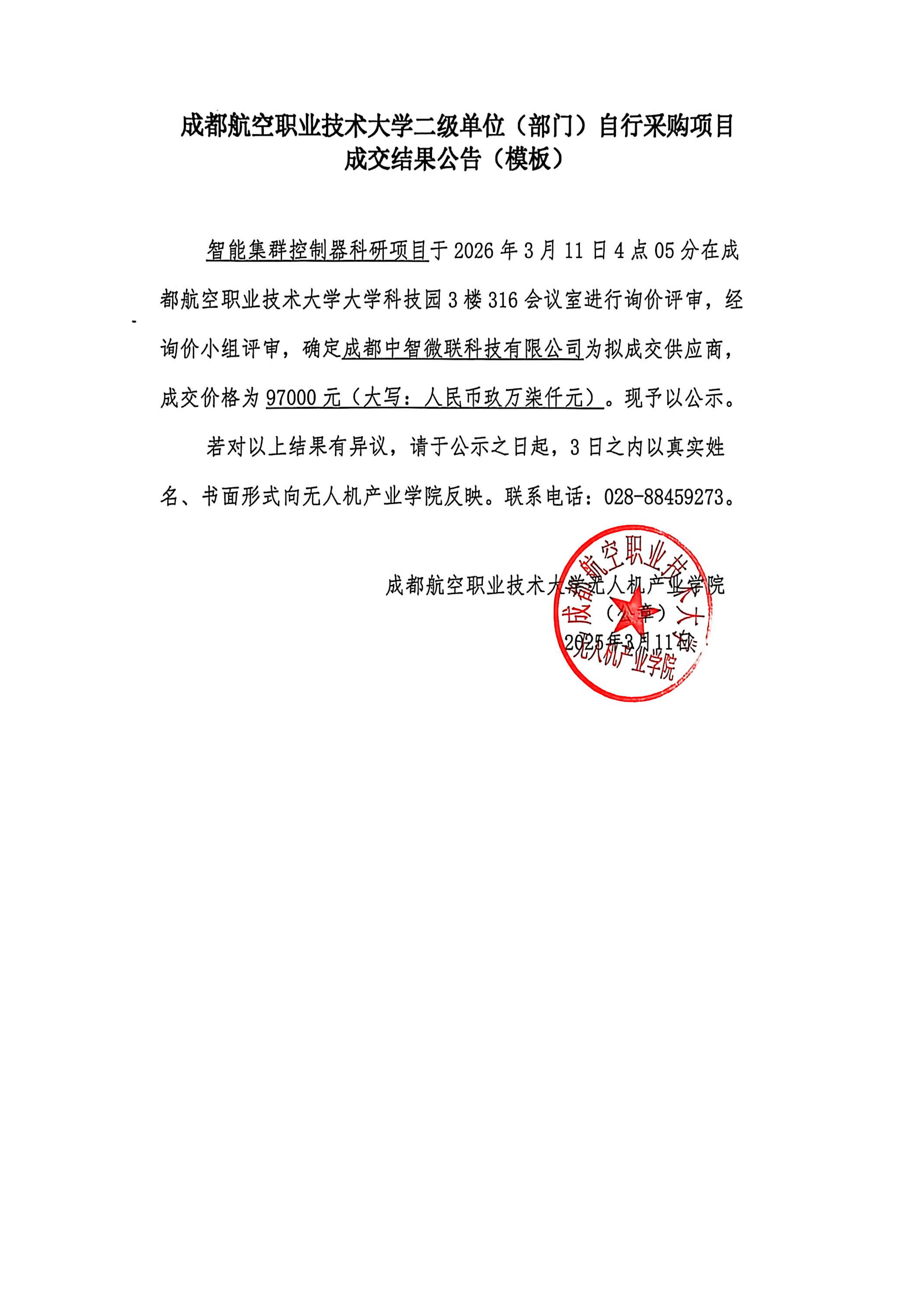 《智能集群控制器科研项目》成交结果公告