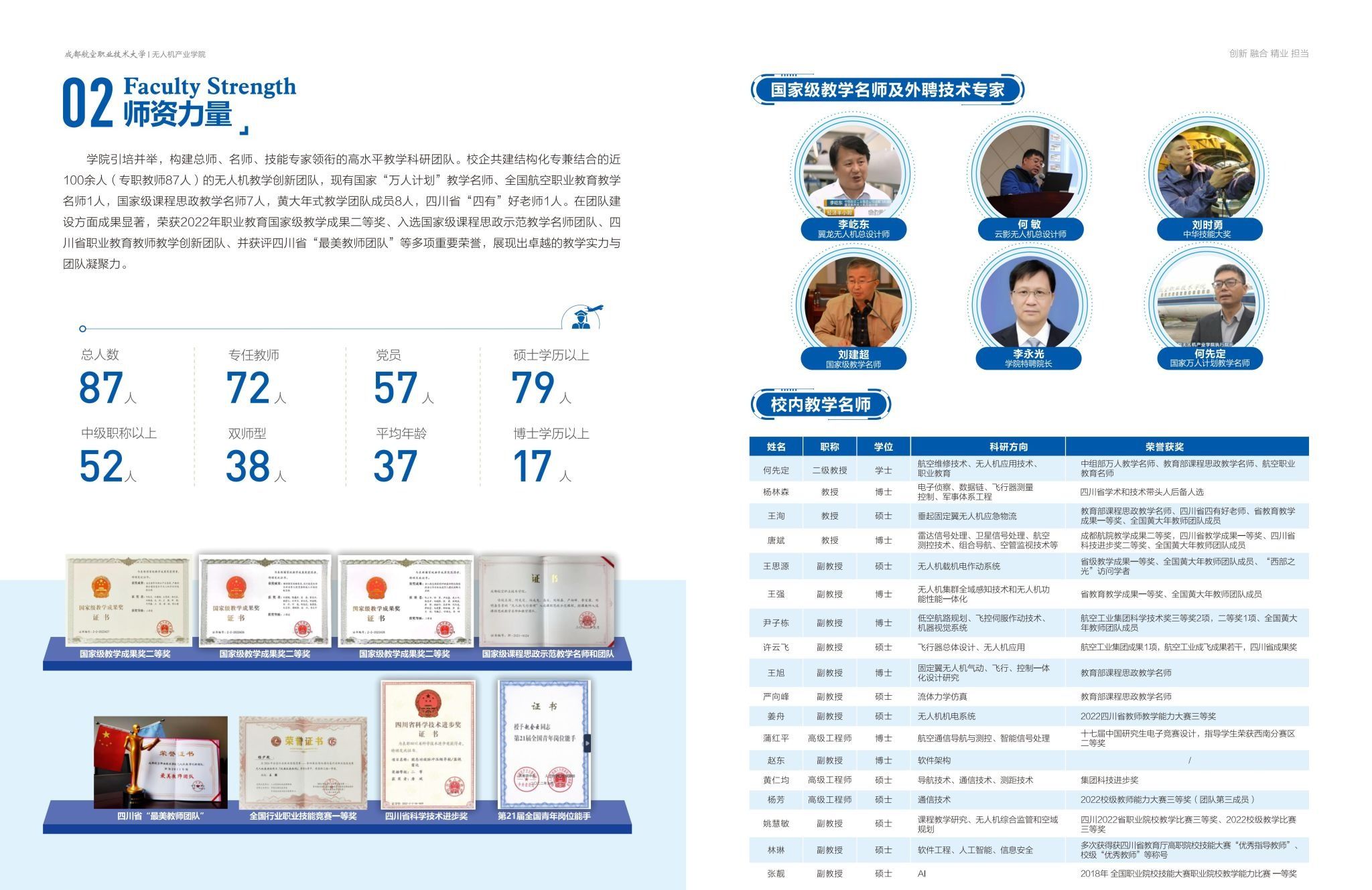 学院引培并举,构建总师、名师、技能专家领衔的高水平教学科研团队。校企共建结构化专兼结合的近100余人(专职教师87人)的无人机教学创新团队,现有国家“万人计划”教学名师、全国航空职业教育教学名师1人,国家级课程思政教学名师7人,黄大年式教学团队成员8人,四川省“四有”好老师1人。在团队建设方面成果显著,荣获2022年职业教育国家级教学成果二等奖,入选国家级课程思政示范教学名师团队、四川省职业教育教师教学创新团队,并获评四川省“最美教师团队”等多项重要荣誉,展现出卓越的教学实力与团队凝聚力。