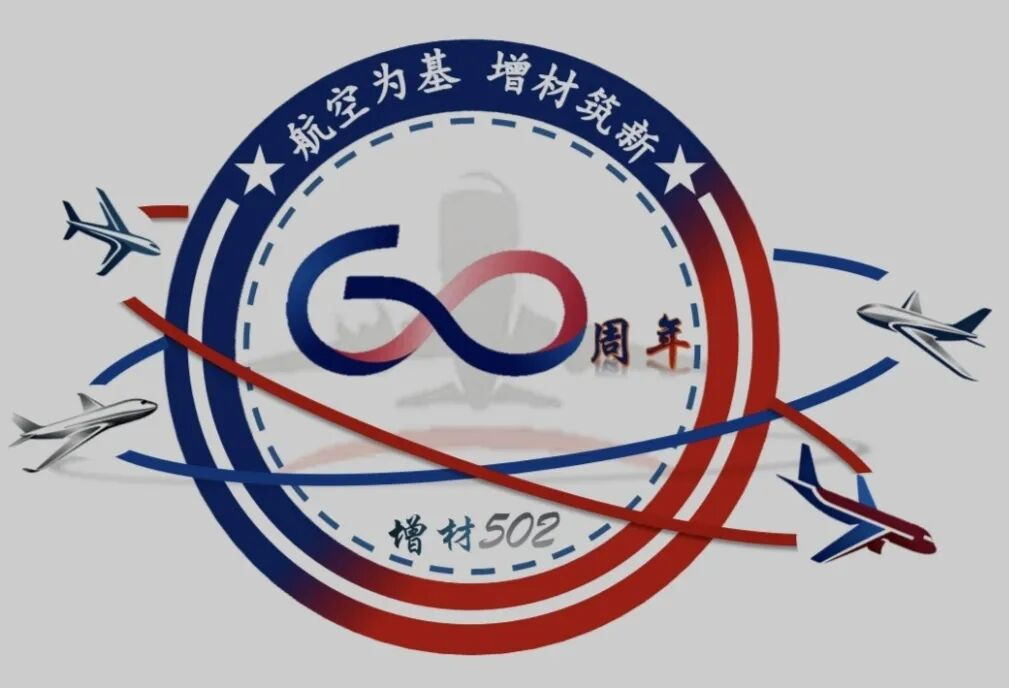 设计元素:圆形轮廓、飞机及轨迹线、“60周年”(形似无穷符号)、“航空为基,增材筑新”文字、“增材502”标识。