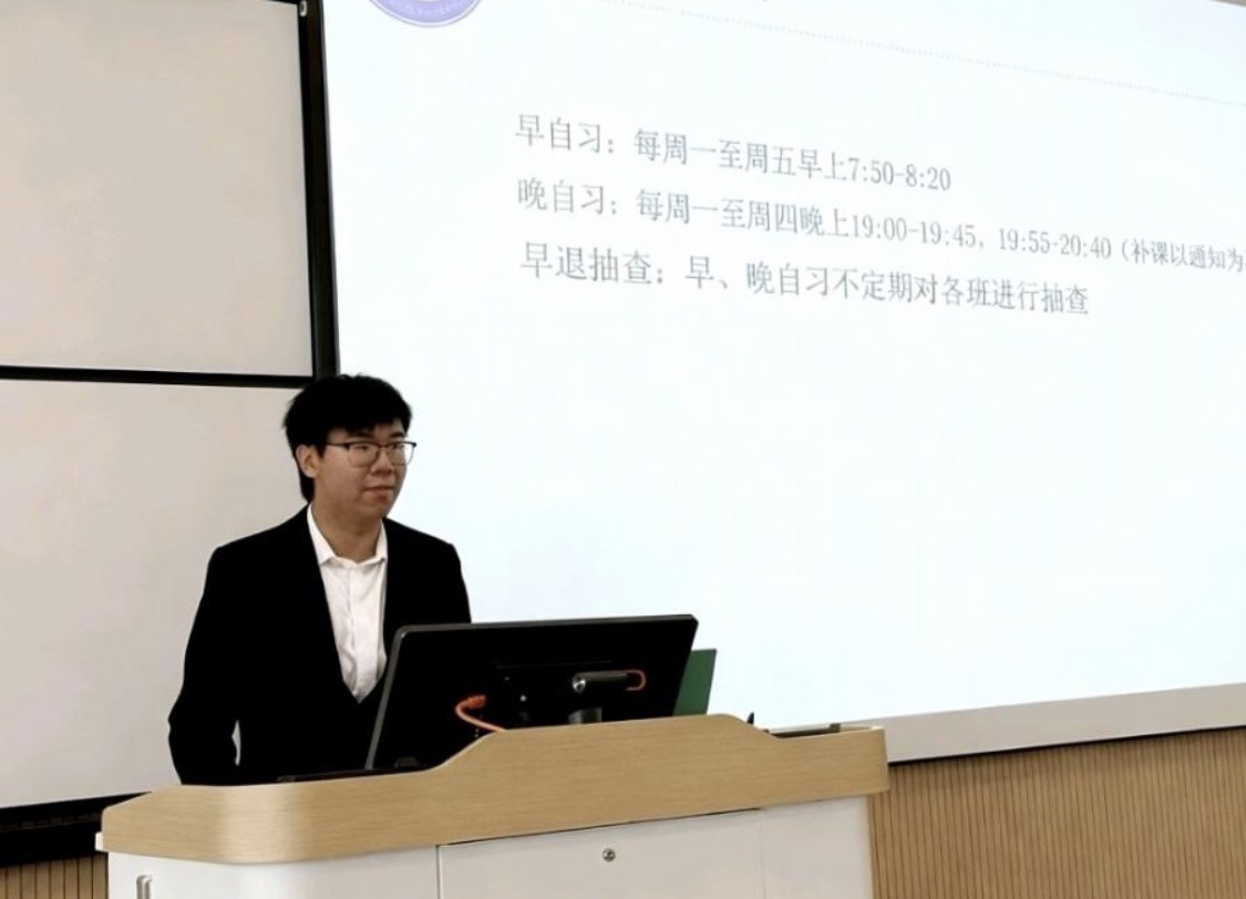 会议第一项议程由生活权益部负责人王睿溢就学院常规考核细则作详细介绍。围绕日常管理核心内容,他系统介绍了早晚自习考勤规范、假条申请流程、晚锻炼组织方式及月度常规工作安排,并清晰说明了月常规成绩的评定方式与相应激励机制。通过逐条解读,各班班委和权益部干事进一步明确了常规细则标准与要点,为后续工作的顺利推进奠定基础。