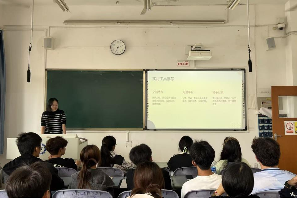 会上,王梦嘉从角色定位与核心职责、日常工作实操方法、近期任务、工作方法与资源、作风建设要求五方面展开。她明确团支书需做好思想引领、组织建设和服务同学工作,班长要负责班级管理、沟通桥梁搭建与活动组织,强调班团骨干需分工协作,善用腾讯文档、QQ群等工具,高效处理通知传达、班会组织等事务。