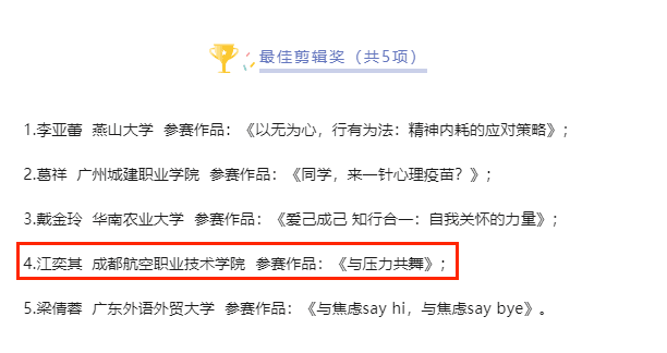 近日,第五届全国高校心理健康课程微视频比赛结果公布,由我校心理健康辅导中心选送,军士管理学院辅导员江奕其的心理微课《与压力共舞》荣获三等奖和“最佳剪辑奖”。本次比赛由京心舍联合国内诸多高校发起,旨在贯彻落实《教育部普通高等学校学生心理健康教育课程教学基本要求》(教思政厅[2011]5号)、《关于加强心理健康教育的指导意见》(国卫疾控发[2016]77号)文件精神,充分发挥课堂教学在大学生心理健康教育工作中的主渠道作用,促进高校学生心理健康教育工作提质增效,强化心理健康数字资源建设。