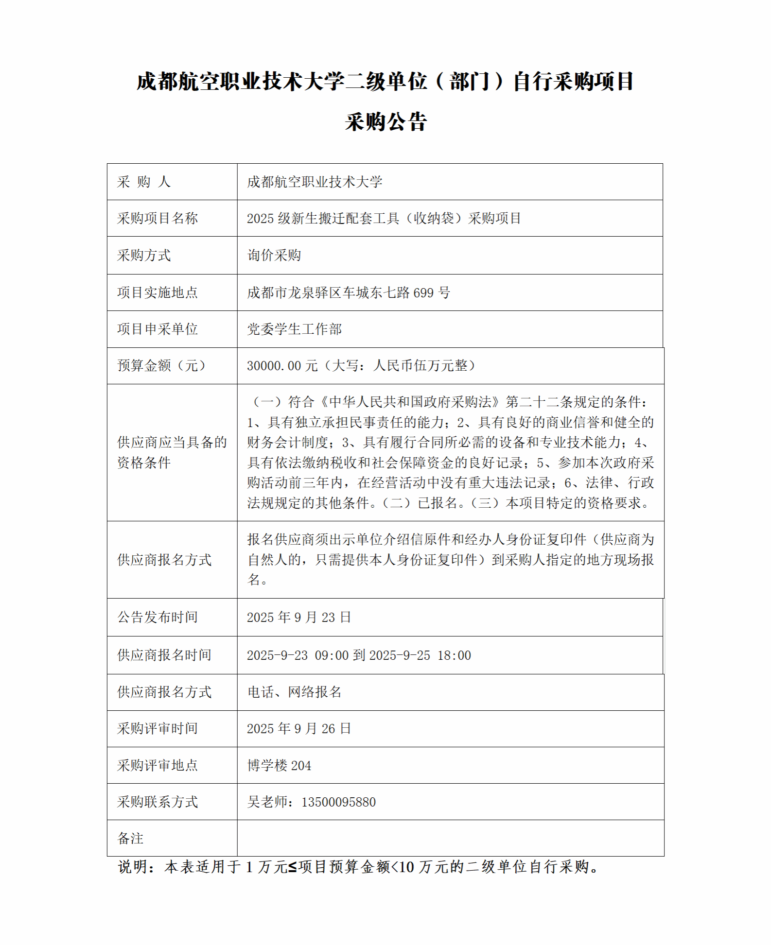 成都航空职业技术大学二级单位(部门)自行采购项目采购公告