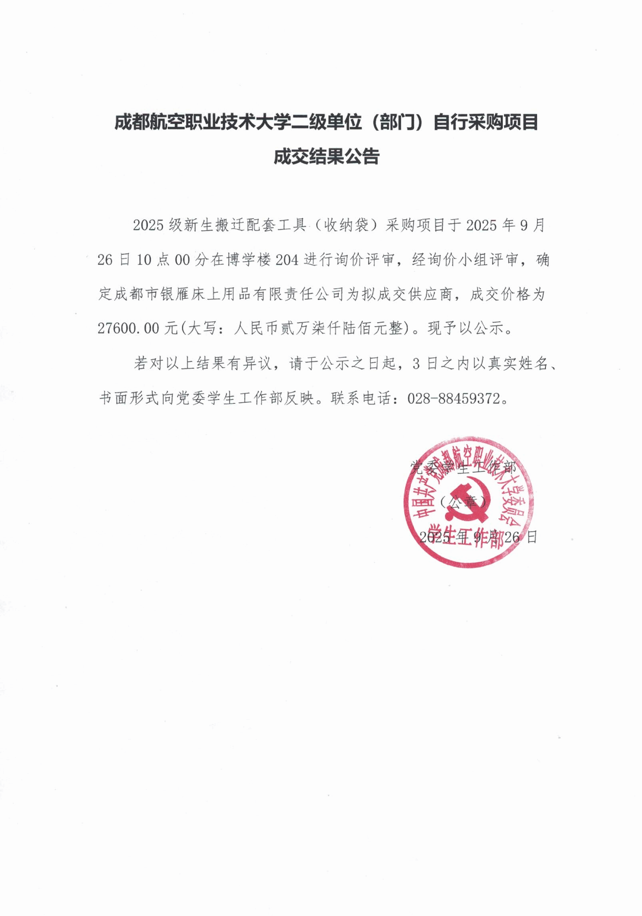 成都航空职业技术大学二级单位(部门)自行采购项目成交结果公告