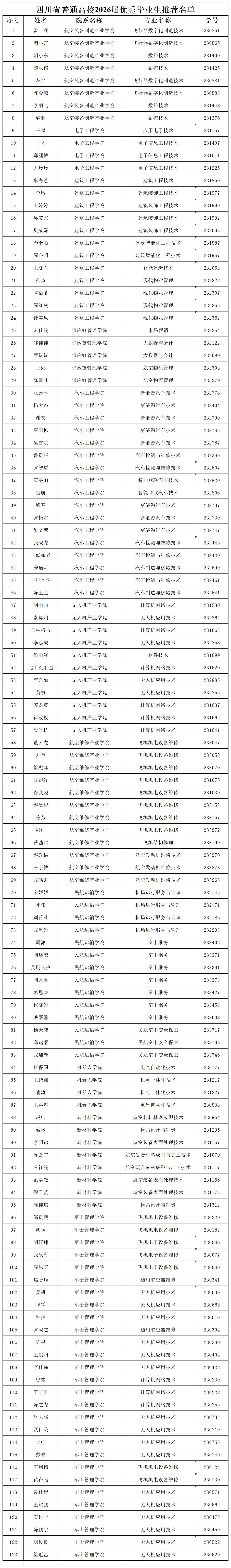 成都航空职业技术大学拟推荐四川省普通高校2026届优秀毕业生推荐名单公示 来源单位:党委学生工作部 发布时间:2025-12-01 浏览数量:53次 经学生本人申请、院系初审、学校审核,拟推荐四川省普通高校2026届优秀毕业生推荐名单见附件,公示时间:2025年12月1日——12月5日。师生对公示对象如有异议,请与党委学生工作部张老师联系,电话:88459372。附件:四川省普通高校2026届优秀毕业生推荐名单。成都航空职业技术大学党委学生工作部2025年12月1日