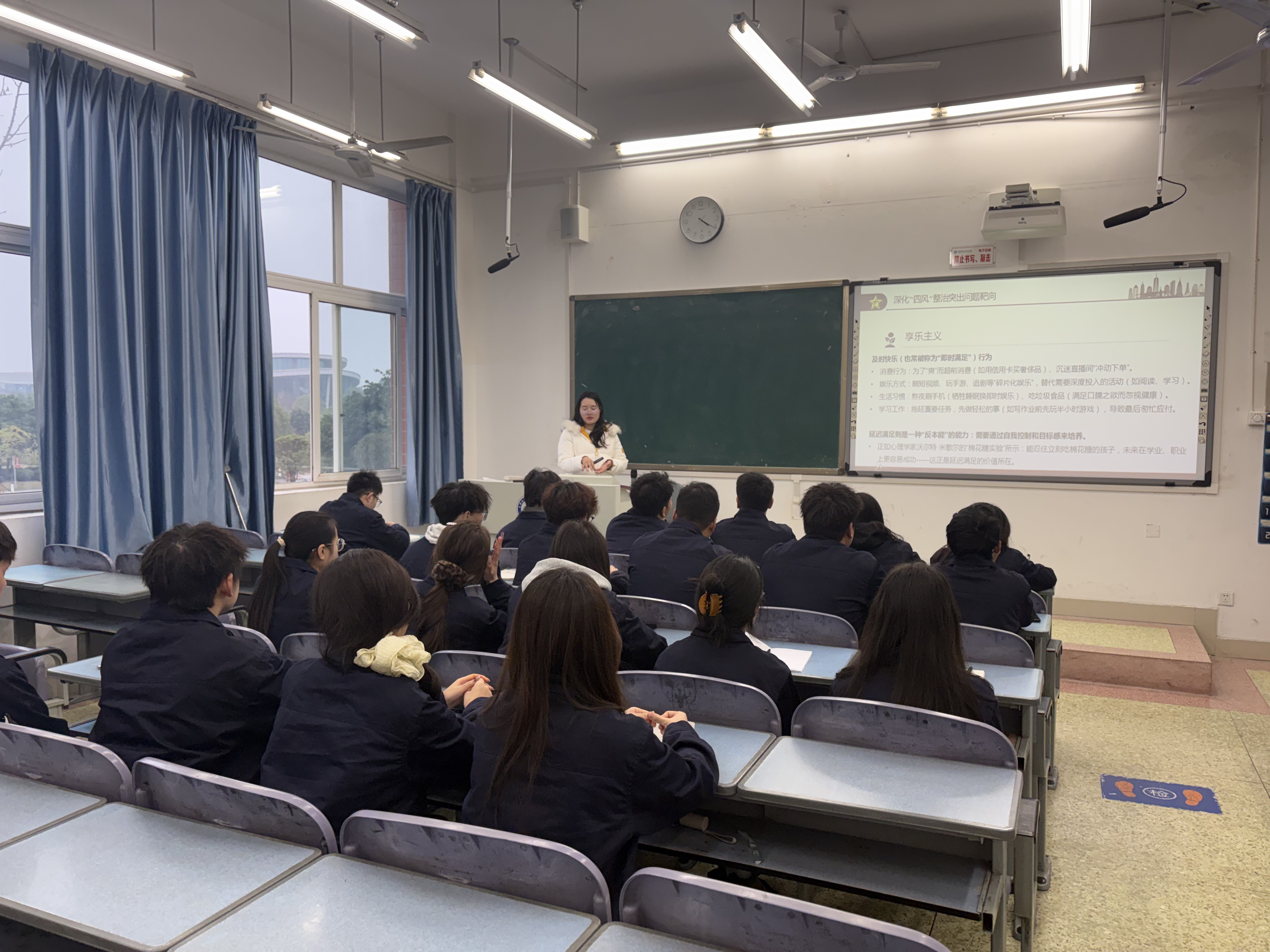 课堂上,邵敏结合校园实际案例,深入剖析了 “四风”问题的本质:形式主义根源在于政绩观错位,表现为重“痕”不重绩、搞“花架子”而忽视实干;官僚主义源于权力观扭曲,体现为脱离同学、漠视基层需求;享乐主义是人生观褪色、奋斗精神弱化,贪图安逸、畏惧艰辛;奢靡之风则是价值观失守,追求铺张浪费、败坏校园风气。邵敏特别带领大家重温了毛泽东同志在1949年党的七届二中全会上提出的“两个务必”——务必使同志们继续地保持谦虚、谨慎、不骄、不躁的作风,务必使同志们继续地保持艰苦奋斗的作风。她以此勉励同学们,要牢记初心使命,自觉抵制歪风邪气,永葆共产党员的政治本色和先进青年的纯粹底色。