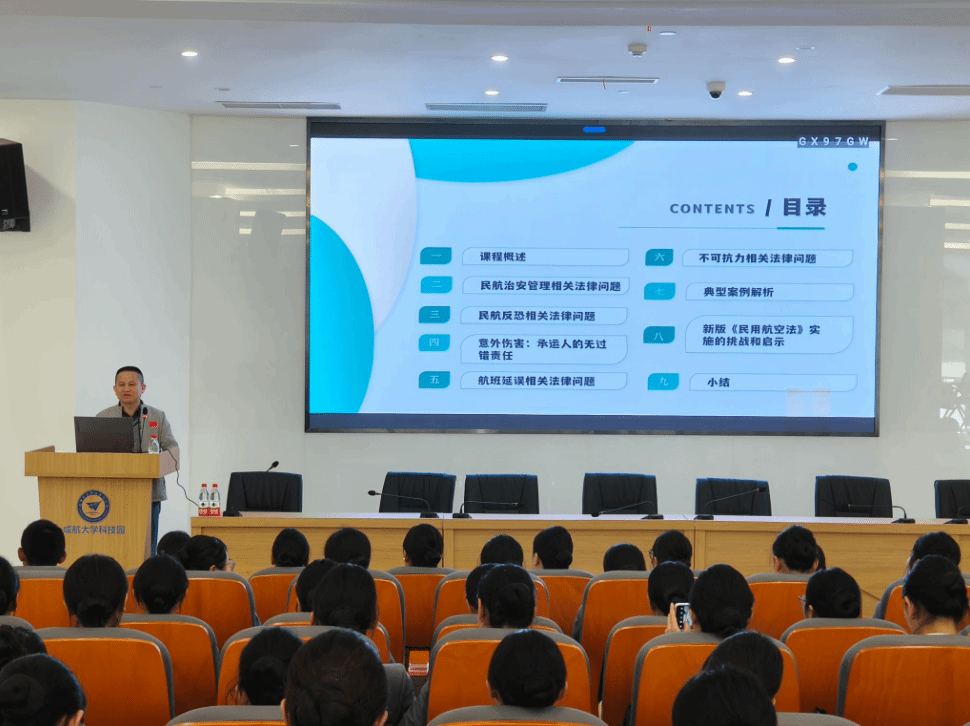 讲座围绕民航客运高频法律场景,聚焦治安管理、反恐防控、航班延误、意外伤害赔偿及不可抗力认定五大板块,结合《中华人民共和国治安管理处罚法》《中华人民共和国反恐怖主义法》《中华人民共和国民法典》及新版《中华人民共和国民用航空法》等法规,系统解析了承运人与旅客的权利义务边界、航班延误责任划分、无过错责任适用等实务要点,并通过编造虚假恐怖信息、航班延误纠纷等典型案例,直观呈现法律条款的实际应用。